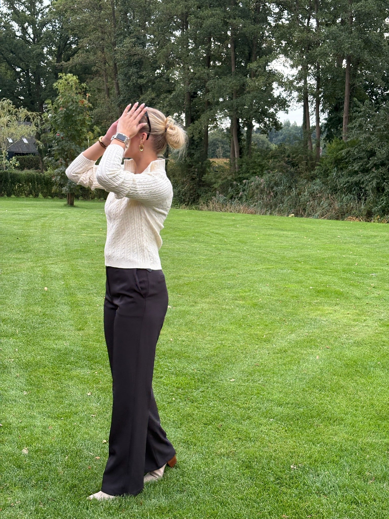 Op de foto's is de Sofia Cream Zip Knit gecombineerd met een zwarte pantalon en onze bruine track pants voor een stijlvolle, minimalistische outfit die perfect is voor everyday wear of een meer geklede gelegenheid.